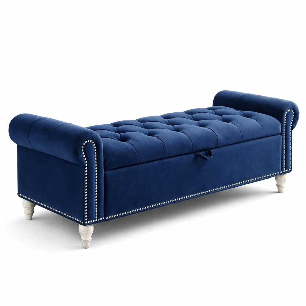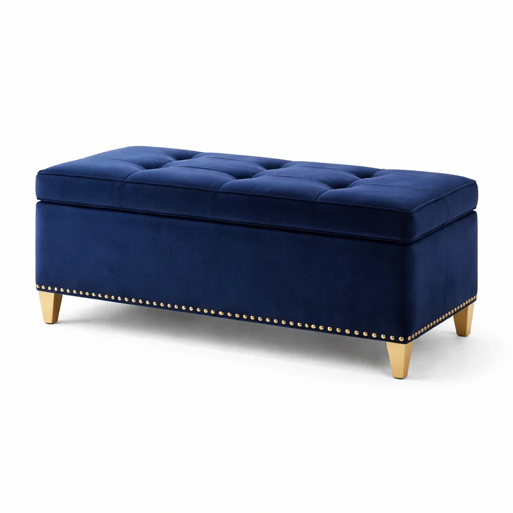Banc de rangement en velours bleu avec pieds en bois et clous décoratifs