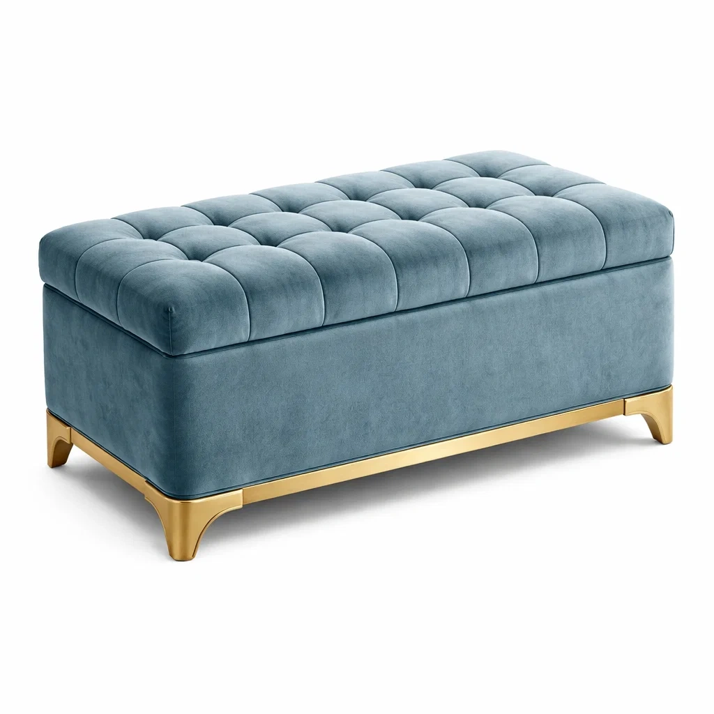 Banc de rangement en velours avec base en métal doré