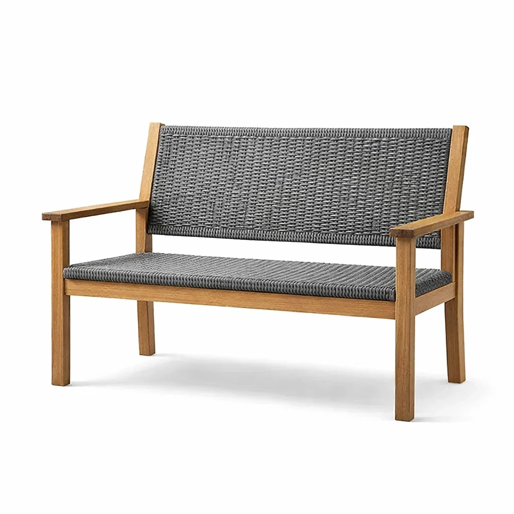 Ce banc est construit avec un cadre en bois d'acacia et une assise et un dossier en résine polyéthylène tressée. Il mesure 120 cm de longueur, 60 cm de profondeur et 80 cm de hauteur, et peut supporter jusqu'à 200 kg. Conçu pour un usage extérieur, il est résistant aux intempéries et facile à entretenir.